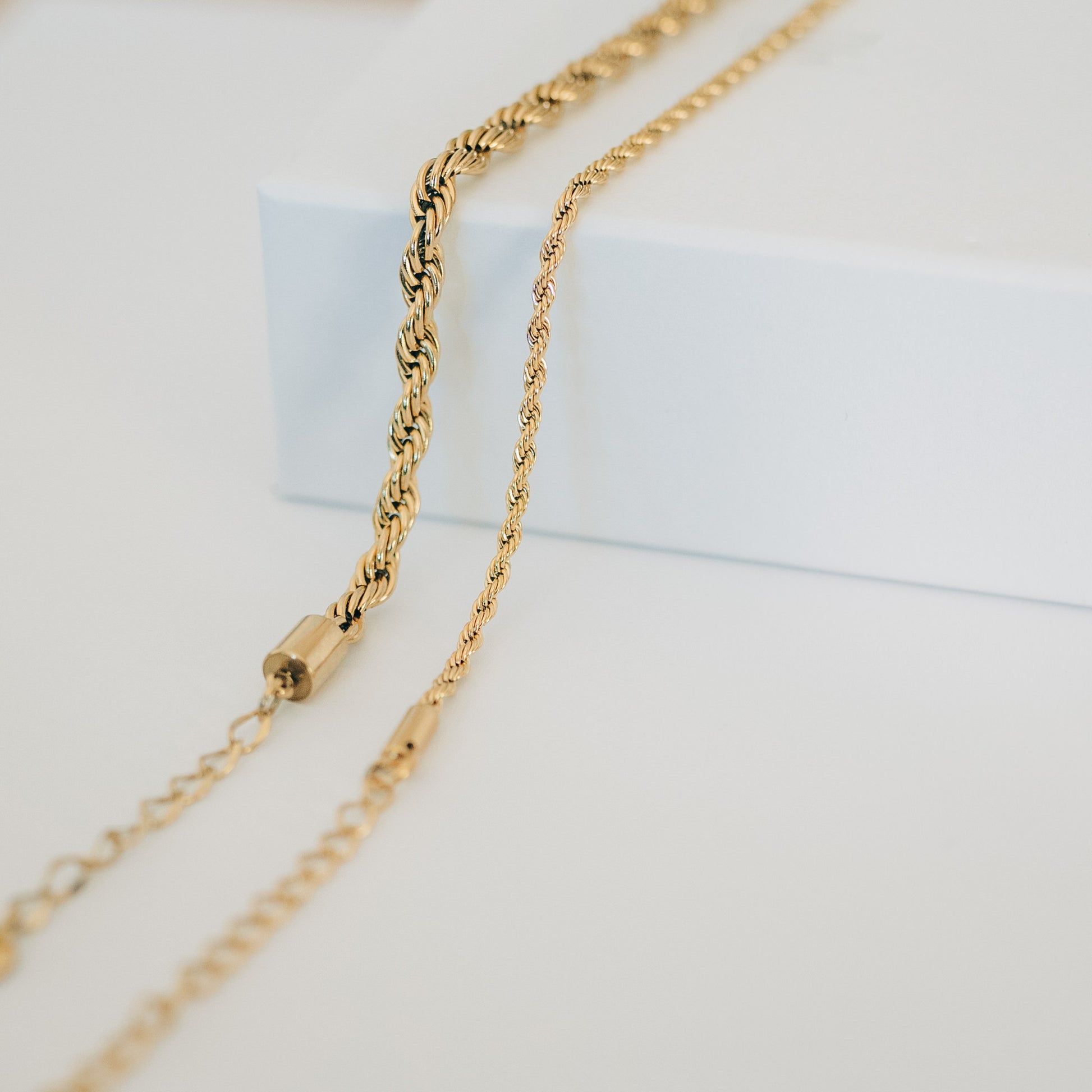 Detta armband är tillverkat i guldpläterat rostfritt stål och har en tunt vriden kedjekonstruktion som skapar ett tvinnat, repinspirerat mönster. Designen ger armbandet ett distinkt men tidlöst uttryck, där ljus reflekteras dynamiskt från kedjans roterande struktur.