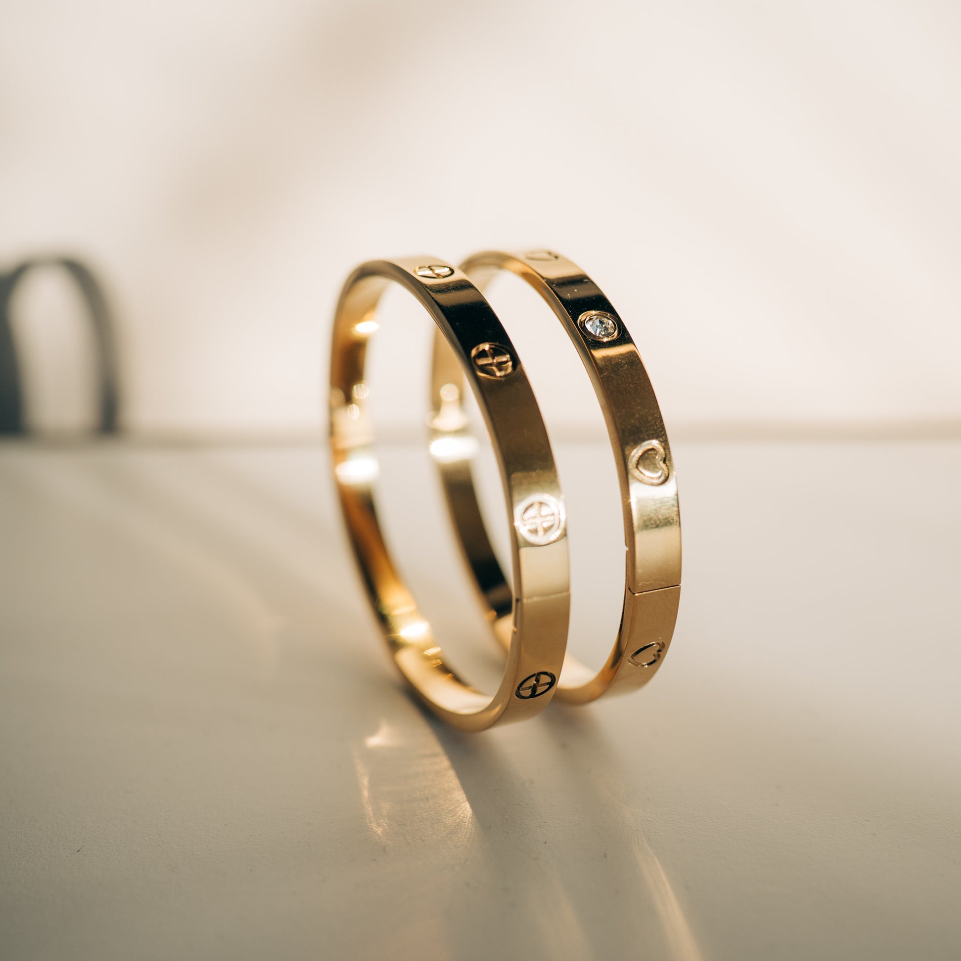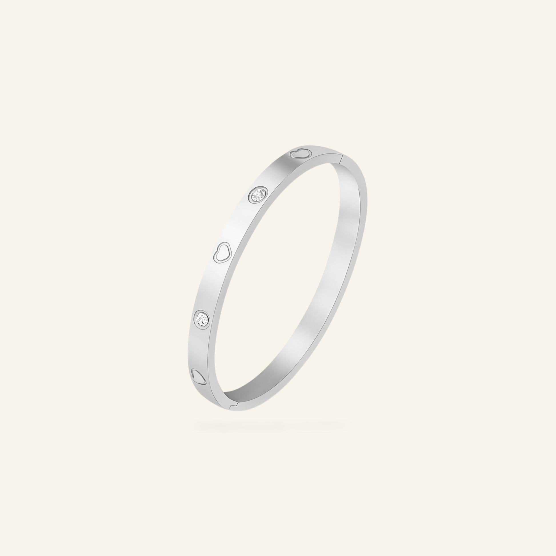 Denna armring är tillverkad i rostfritt stål och pläterad med 18k guld. Den har en slät, rundad profil med infällda klara kristaller och ingraverade hjärtmotiv längs ovansidan. Armringen öppnas med ett diskret gångjärn och klicklås, vilket ger en säker och smidig användning.
