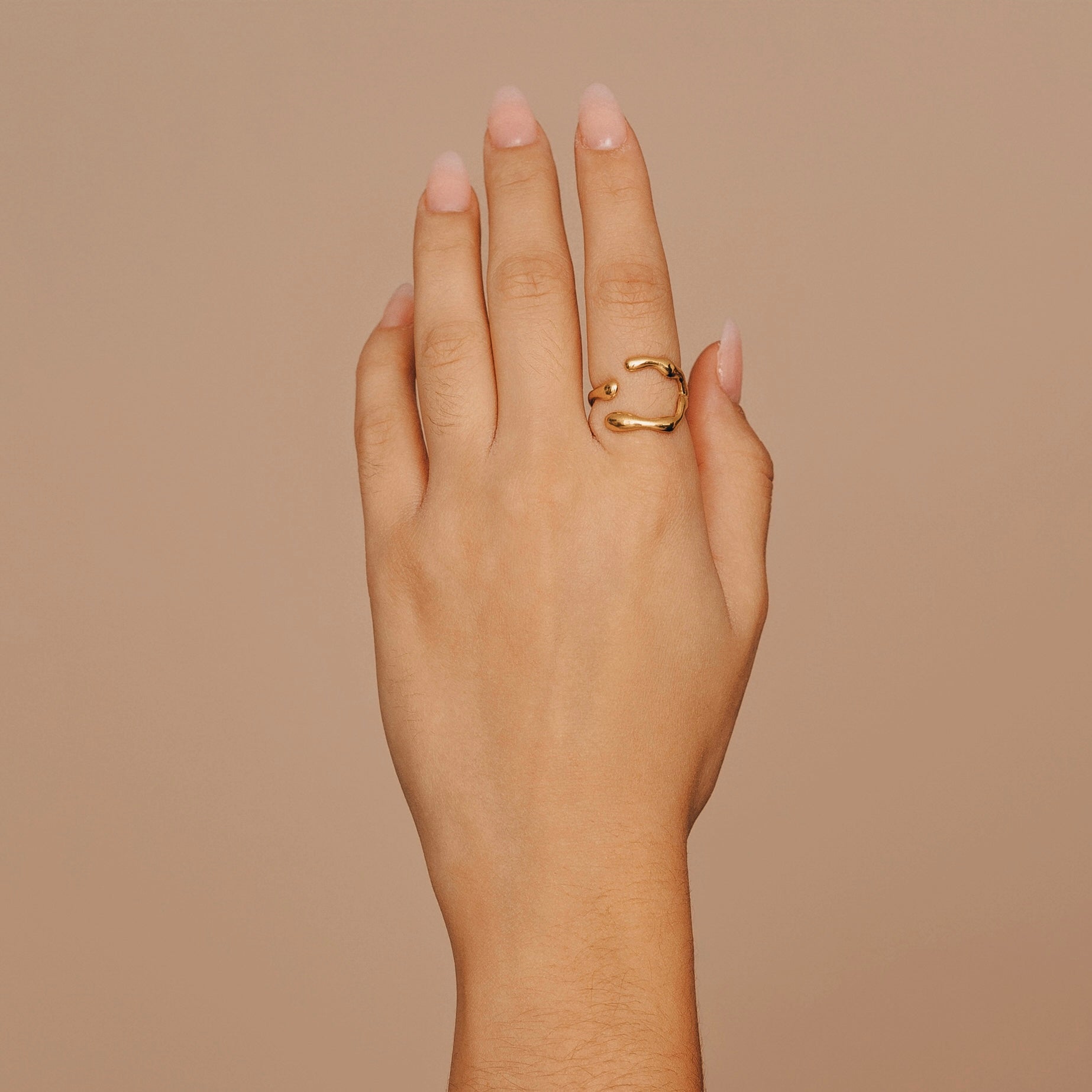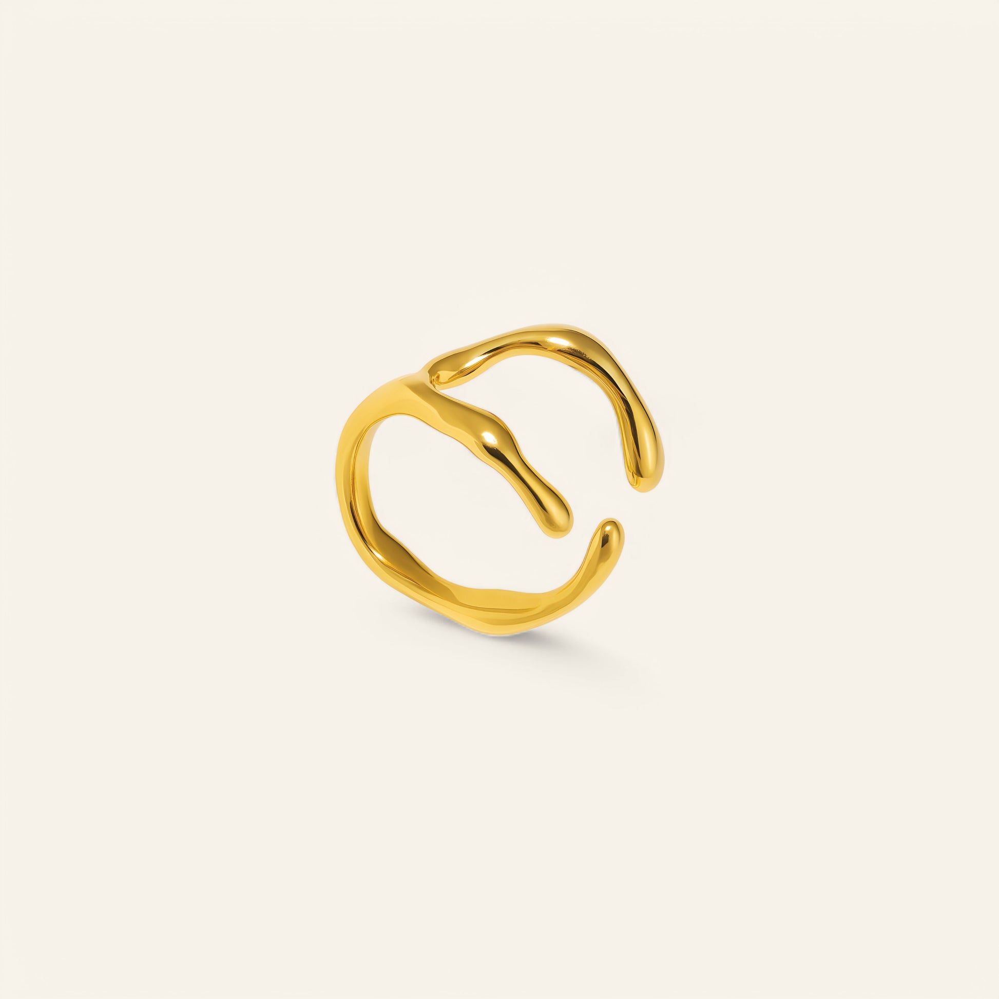 En skulptural ring med en design som påminner om smält metall. Djärv, lekfull och samtidigt elegant – perfekt för den som vill bära något utöver det vanliga. Justerbar passform för bekväm användning