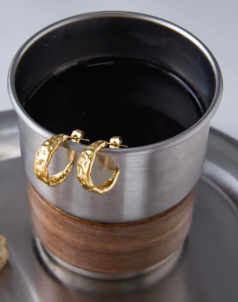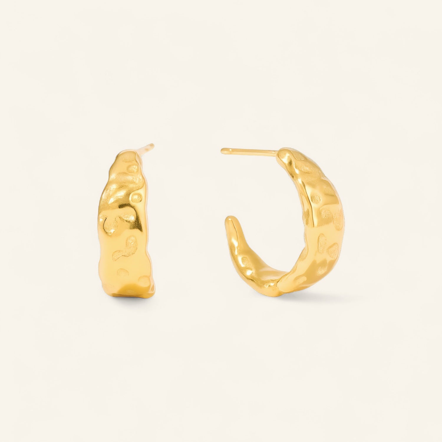 Guldpläterade örhängen i rostfritt stål med hamrad yta som skapar en levande och oregelbunden form. Den halvöppna designen ger ett modernt uttryck samtidigt som den klassiska guldfärgen behåller en tidlös elegans. Dessa örhängen kombinerar struktur och form på ett stilrent sätt och passar både till vardag och fest. Tillverkade i vattentåligt rostfritt stål, vilket gör dem slitstarka och färgbeständiga över tid.