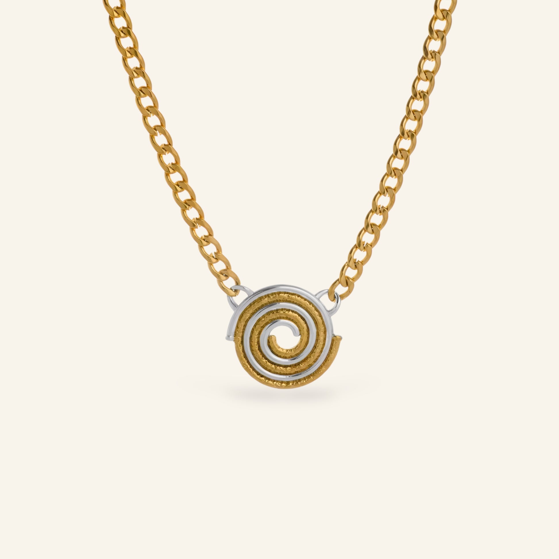Detta guldpläterade halsband är tillverkat i rostfritt stål och har en unik spiralformad berlock i både guld- och silverton. Kombinationen av metallfärger skapar en distinkt kontrast som lyfter fram det skulpturala formspråket i designen. Kedjan har en tydlig, robust länkstruktur som ger ett balanserat intryck mellan råhet och elegans.