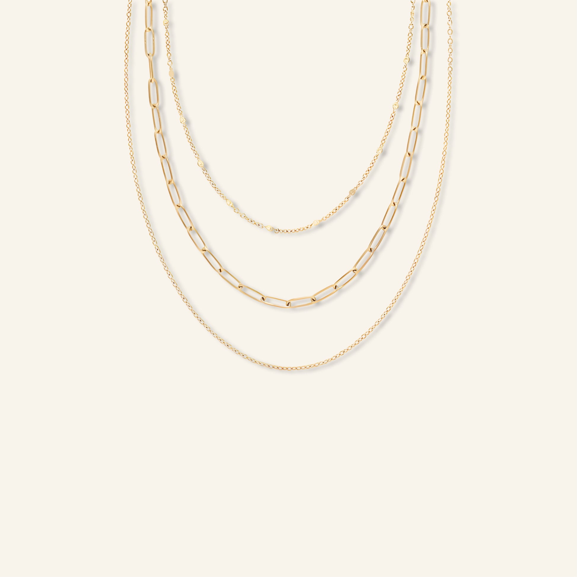 Fånga blicken med detta lager-på-lager halsband som kombinerar tre olika kedjor i en stilren design. Med en balans mellan klassisk enkelhet och trendig edge skapar det ett lyxigt uttryck, perfekt för att lyfta både vardags- och festlooks. Ett smycke som ger en genomtänkt layering-effekt utan ansträngning. Alla halsband är kopplade till samma länk.
