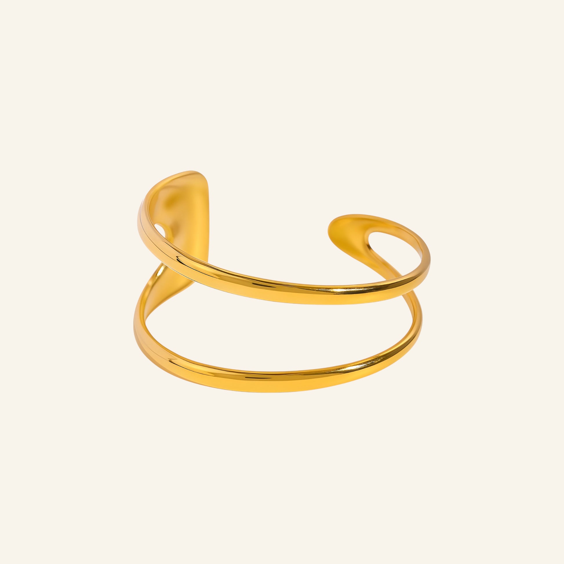 Denna eleganta justerbara armring i guldpläterat rostfritt stål är designad med två parallella band som sveper sig runt handleden i en modern och minimalistisk siluett. Armringen är tillverkad i rostfritt stål för långvarig hållbarhet och motståndskraft mot rost, missfärgning och slitage. Den guldpläterade ytan ger ett lyxigt uttryck samtidigt som den är vattentålig, perfekt för vardagsbruk eller mer uppklädda tillfällen.