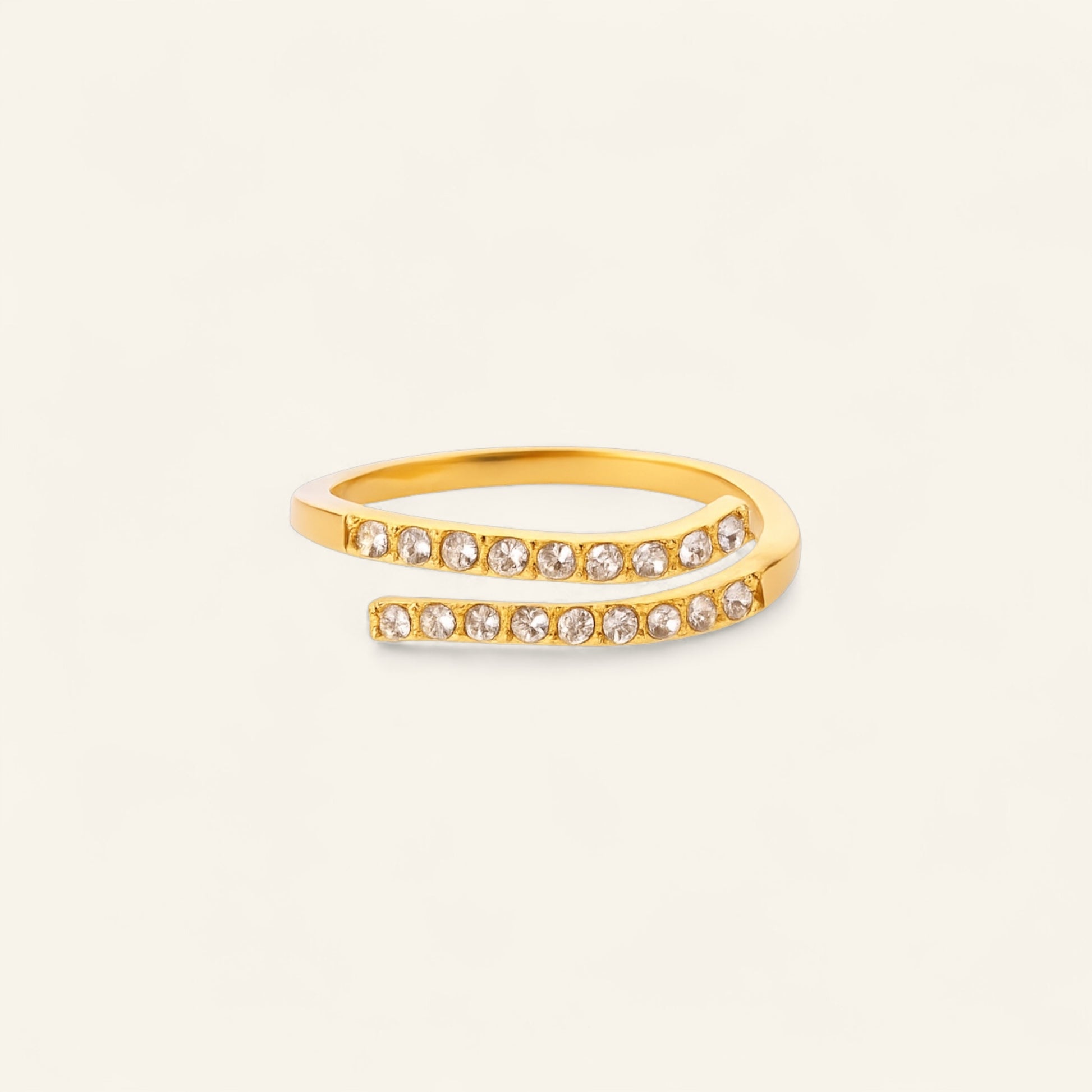 Denna eleganta ring i guldpläterat rostfritt stål är designad med två parallella rader av klara kristaller som följer ringens öppna, böjda form. Den stilrena designen ger ett lyxigt intryck samtidigt som ringen är bekväm att bära tack vare sin justerbara passform.