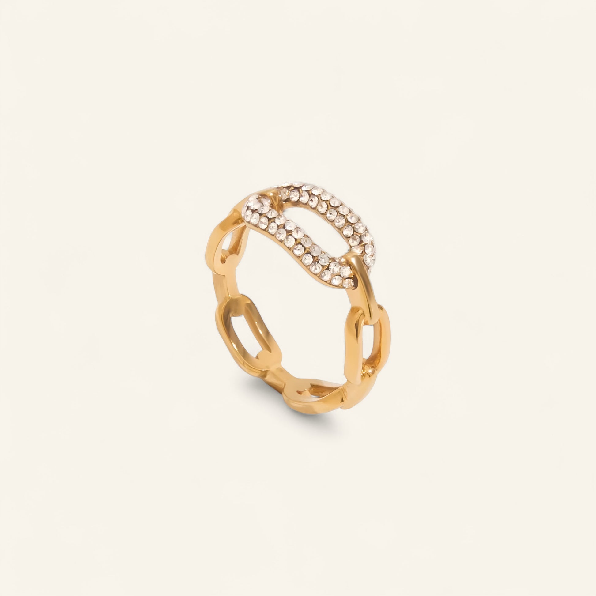 Denna guldpläterade ring i länkformat utförande kombinerar en kraftfull design med eleganta detaljer. Ringen är tillverkad i rostfritt stål och har en solid konstruktion bestående av länkar, där den främre delen är dekorerad med klara kristaller som ger ett subtilt skimmer. Den strukturerade ytan i kombination med de glänsande stenarna skapar ett uttrycksfullt smycke som fungerar lika bra till vardags som till fest.