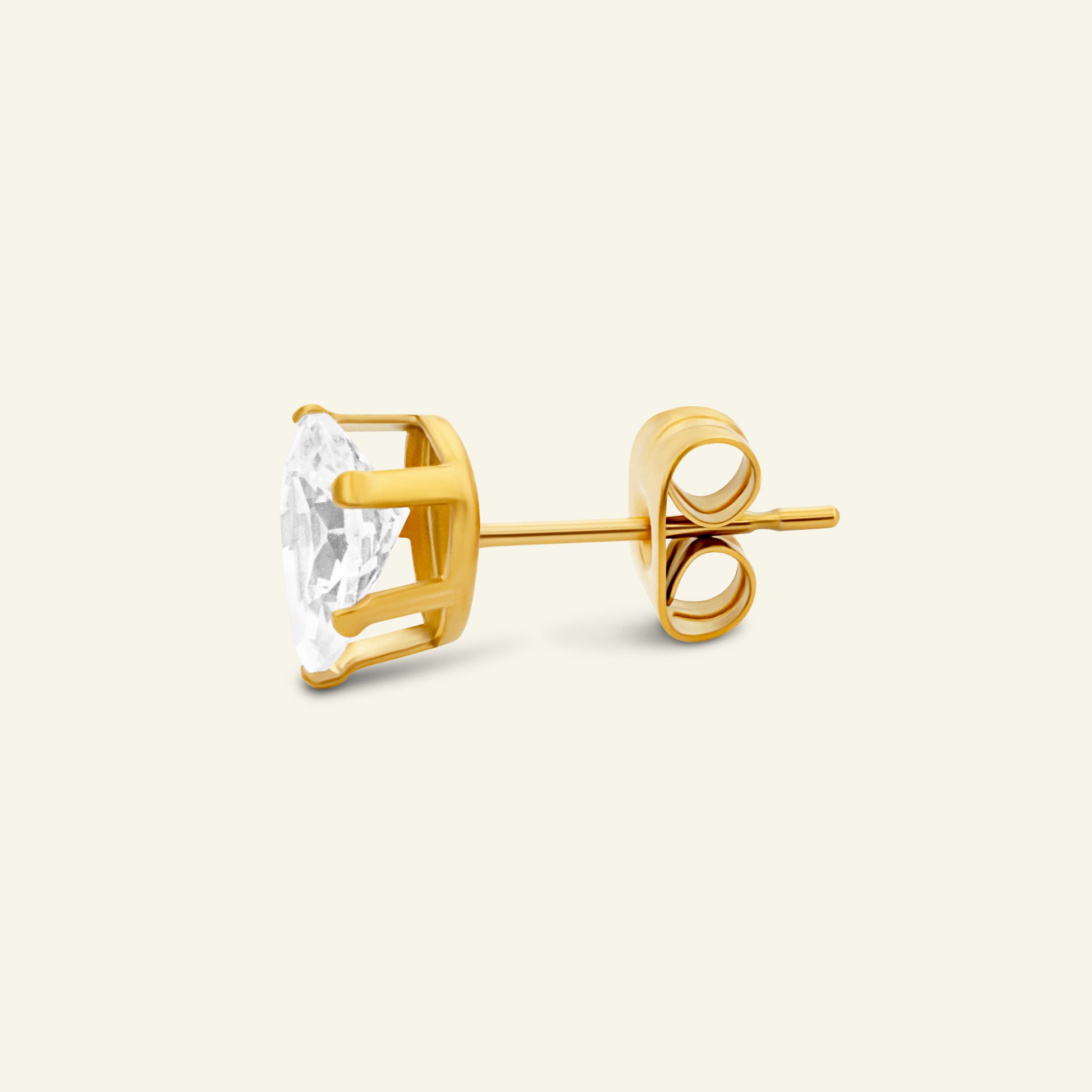 Örhängena är guldpläterade och tillverkade i rostfritt stål, vilket ger dem hög tålighet mot vatten, slitage och missfärgning. Den klara infattningen framhäver kristallens form och färg, medan stiftfästet gör dem enkla att bära.