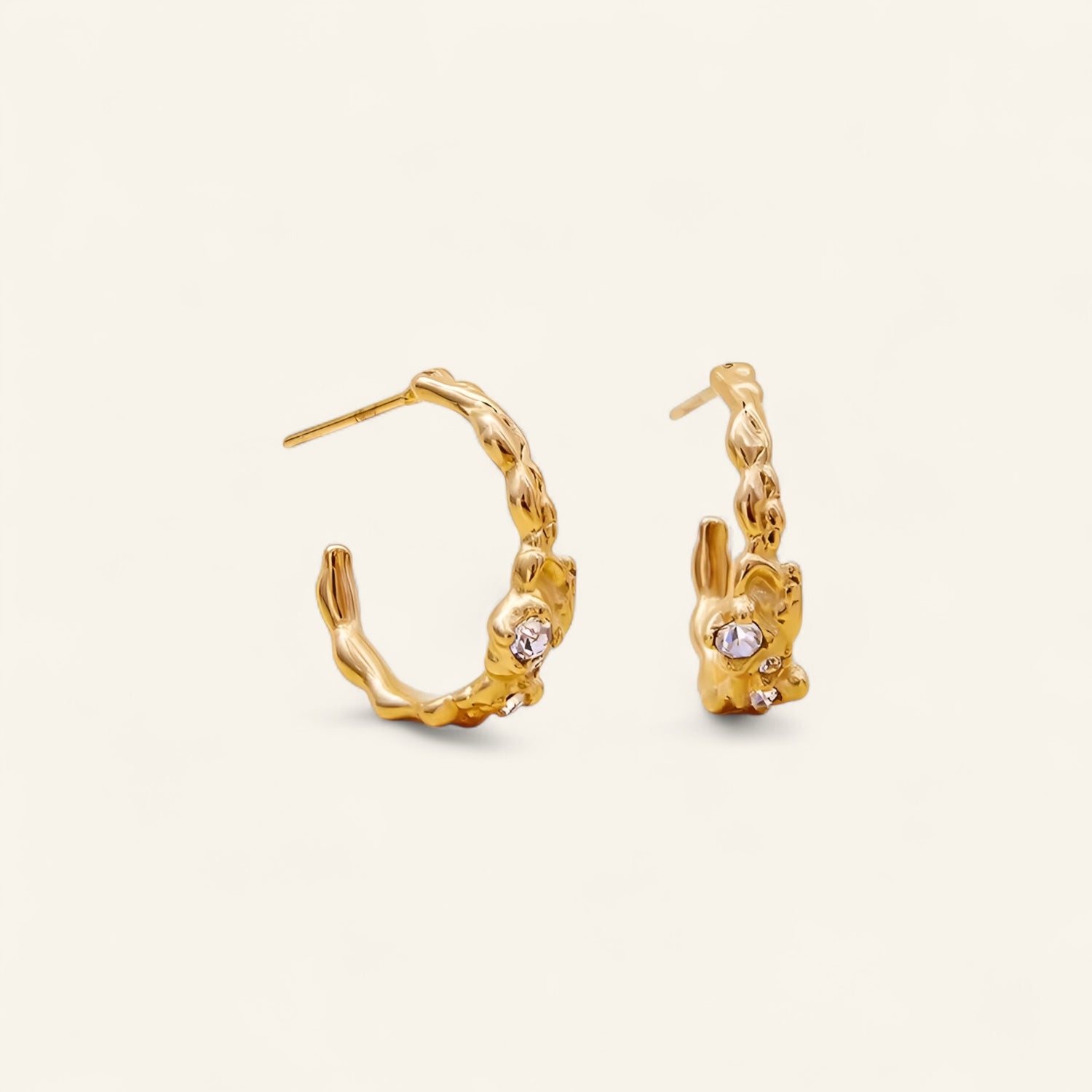 Dessa guldpläterade örhängen i rostfritt stål kombinerar en organisk, oregelbunden form med subtila infattade stenar som ger ett elegant och distinkt uttryck. Den strukturerade ytan skapar ett dynamiskt ljusspel, medan de små klara stenarna är strategiskt placerade för att ge en diskret glans. Örhängena är tillverkade i rostfritt stål och pläterade med ett lager guld för att säkerställa både hållbarhet och en tidlös finish.
