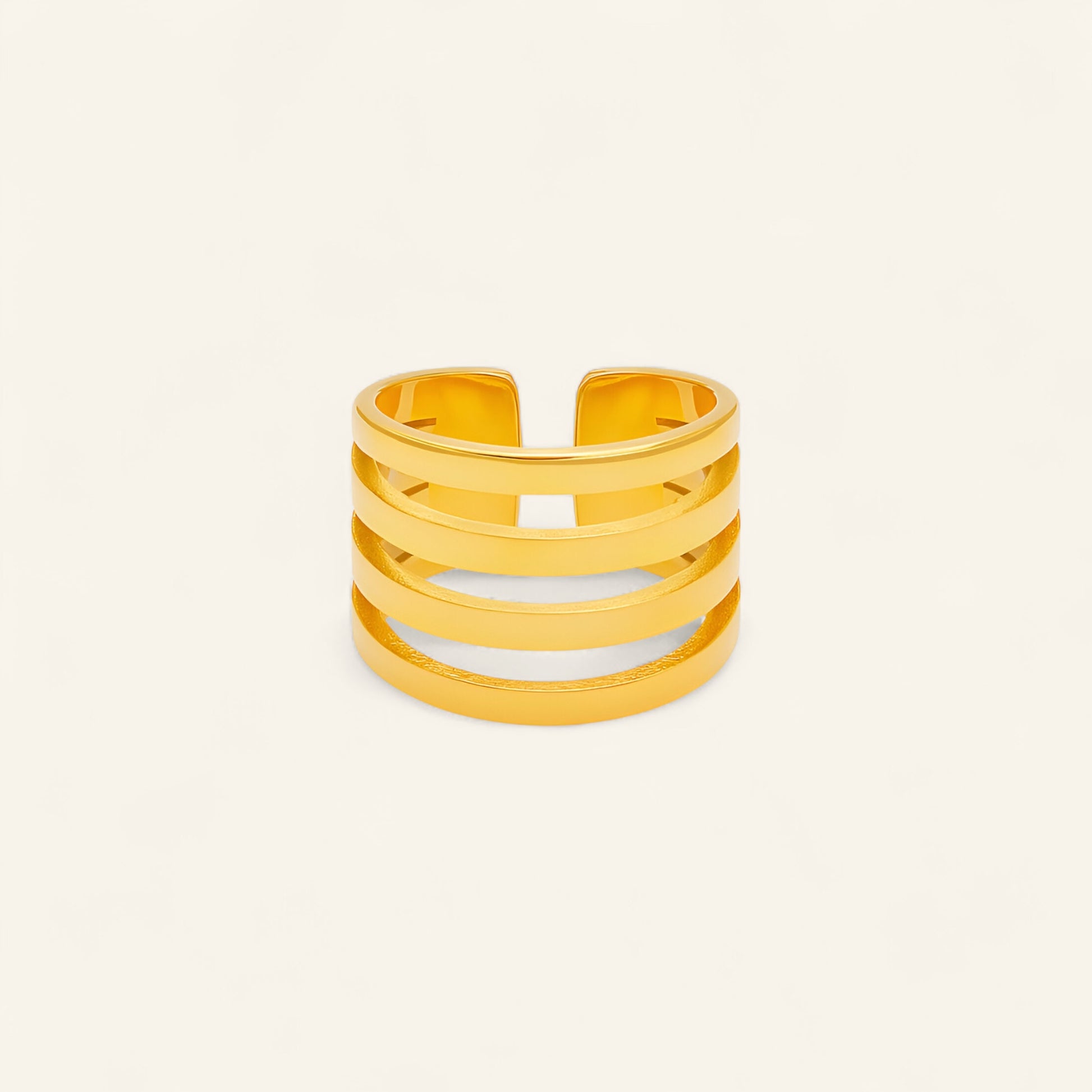 Denna öppna ring i rostfritt stål är guldpläterad och har en bred, ribbad design med fyra horisontella band. Den luftiga och arkitektoniska formen skapar ett uttrycksfullt smycke med stark visuell närvaro. Den öppna konstruktionen ger en flexibel passform och ett bekvämt grepp kring fingret.