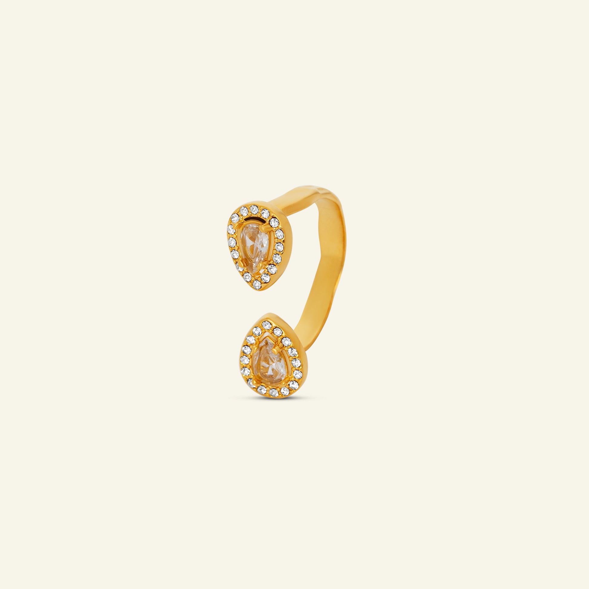 En elegant ring som fångar blicken med sina två droppformade kristaller, omslutna av en gnistrande rad små stenar. Den öppna designen ger en modern och lyxig känsla – perfekt för att lyfta både vardags- och festlooken med subtil glamour och elegans.